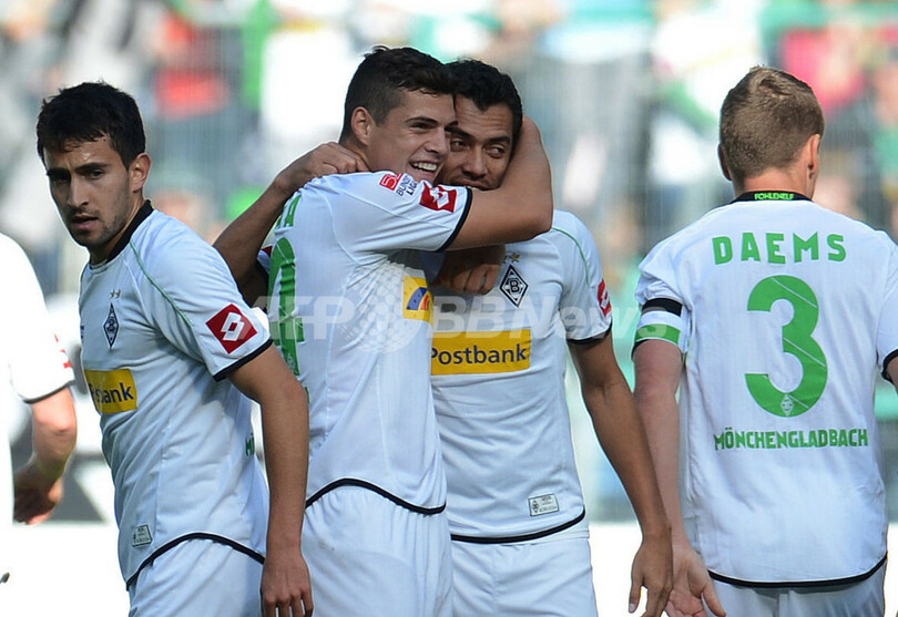 前半8分に先制点を挙げ、チームメイトのグラニト・チャカ(Granit Xhaka、中央左)から祝福されるボルシア・メンヘングラッドバッハのフアン・アランゴ(Juan Arango、中央右、2012年10月7日撮影)。(c)AFP/PATRIK STOLLARZ