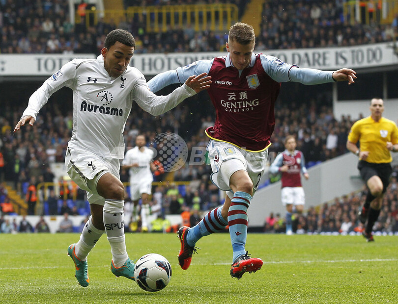 アストン・ビラのジョー・ベネット(Joe Bennett、右)とボールを競るトッテナム・ホットスパーのアーロン・レノン(2012年10月7日撮影)。(c)AFP/IAN KINGTON