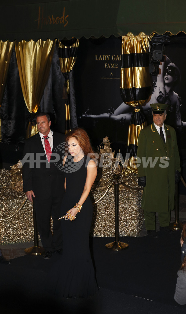 米歌手レディー・ガガ(Lady Gaga)が7日、英ロンドン(London)の高級百貨店「ハロッズ(Harrods)」で、自身がプロデュースした香水「フェイム(Fame)」のプロモーションを行った。写真は、会場に到着したガガ(2012年10月7日撮影)。(c)AFP/JUSTIN TALLIS
