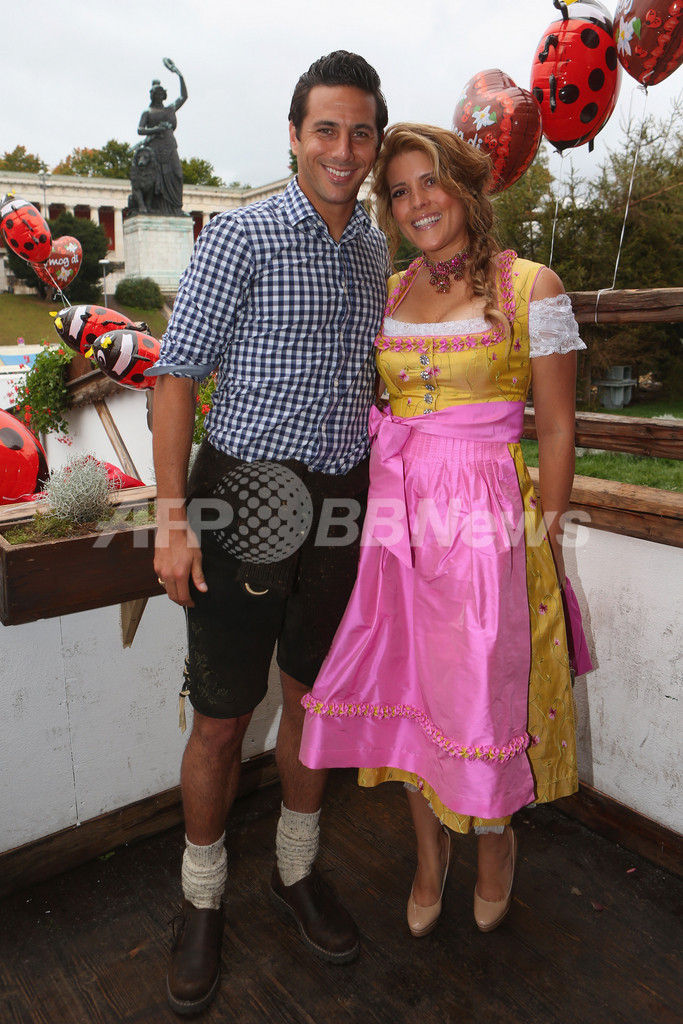 伝統の衣装に身を包み会場に訪れたバイエルン・ミュンヘンのクラウディオ・ ピサロ(Claudio Pizarro、左)と妻のカーラ・サルセド(Karla Salcedo)さん(2012年10月7日撮影)。(c)AFP/POOL/ALEXANDER HASSENSTEIN