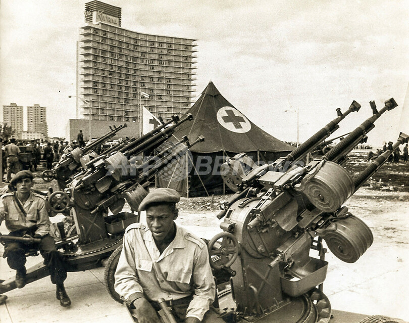 写真は、キューバ・ハバナ(Havana)のリビエラホテル(Riviera hotel)前で、チェコスロバキア製の対空砲を配備する民兵ら(1962年10月撮影)。(c)AFP/Granma