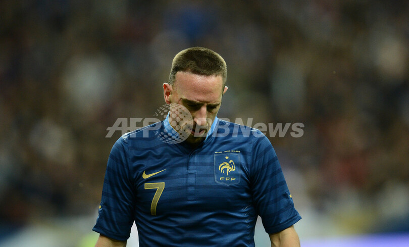 敗戦を喫し、うつむくフランスのフランク・リベリ(Franck Ribery、2012年10月12日撮影)。(c)AFP/FRANCK FIFE