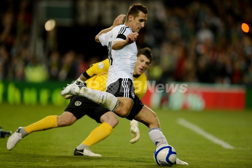 アイルランドのGKキーラン・ウェストウッド(Keiren Westwood、奥)をかわしてシュートを狙うドイツのミロスラフ・クローゼ(Miroslav Klose、2012年10月12日撮影)。(c)AFP/PATRIK STOLLARZ