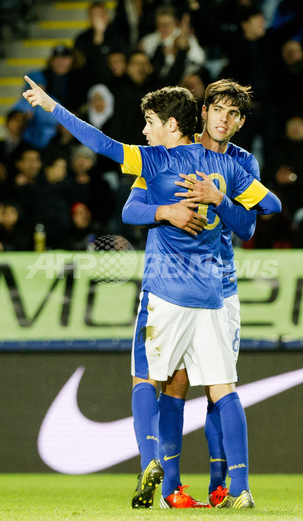 得点を喜ぶブラジルのカカ(Kaka、奥)と、オスカル(Oscar dos Santos Emboaba Junior、2012年10月11日撮影)。(c)AFP/SARA STRANDLUND