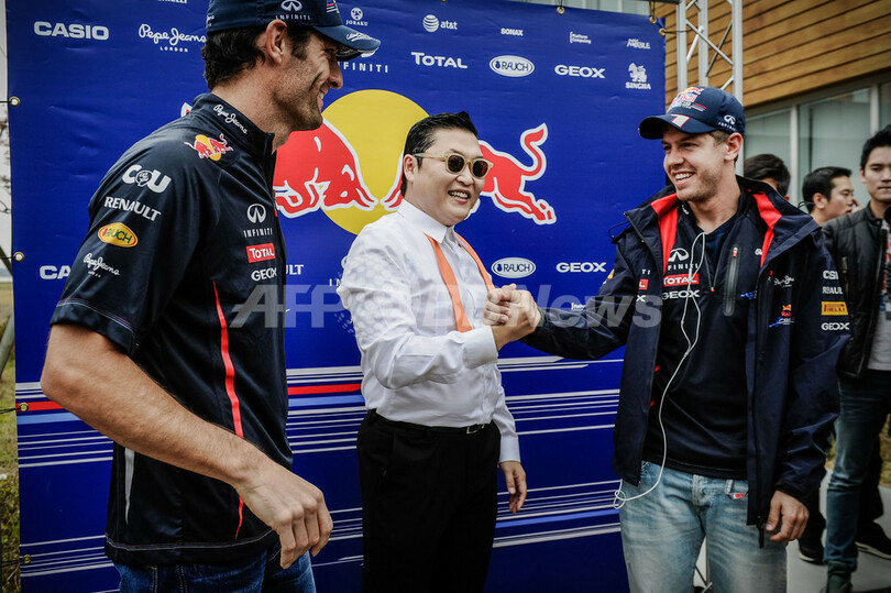 レッドブル(Red Bull)のマーク・ウェーバー(Mark Webber、左)、セバスチャン・ベッテル(Sebastian Vettel)と言葉を交わすPSY(2012年10月14日撮影)。(c)AFP/Philippe Lopez