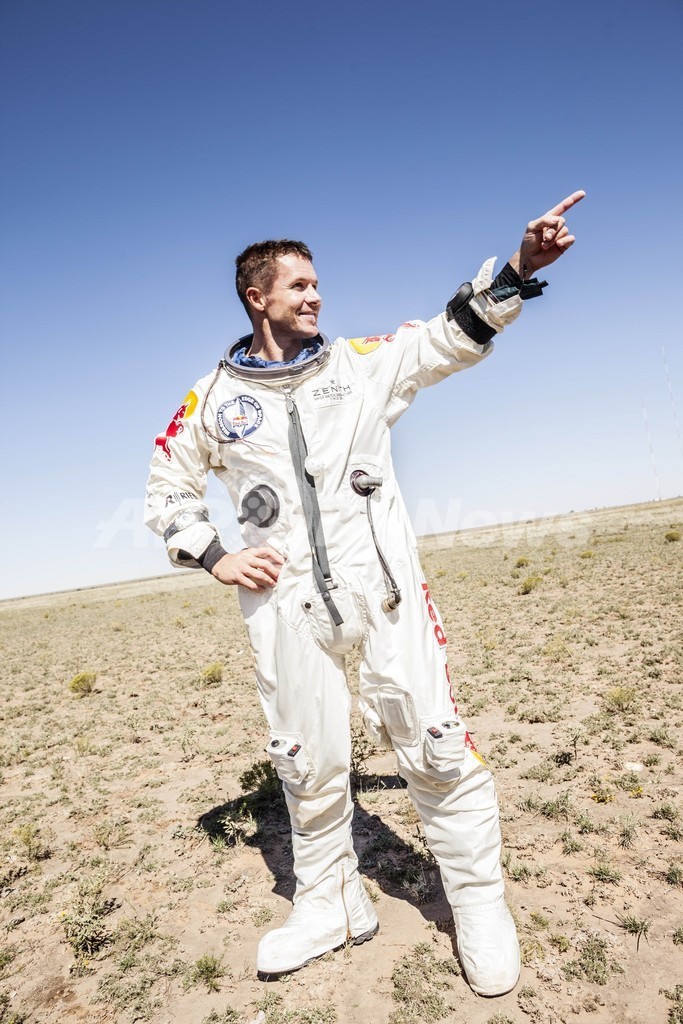 【10月15日 AFP】(写真追加)高所からパラシュートを使って飛び降りる「フリーフォール」の第一人者、オーストリア人のフェリックス・バウムガルトナー(Felix Baumgartner)氏(43)は14日、ヘリウムを詰めた気球で高度12万8097フィート(約3万9044メートル)に上がったカプセルからダイビングを行い、飛び降りてから4分20秒後にパラシュートを開いて米ニューメキシコ(New Mexico)州ロズウェル(Roswell)に無事に着地した。