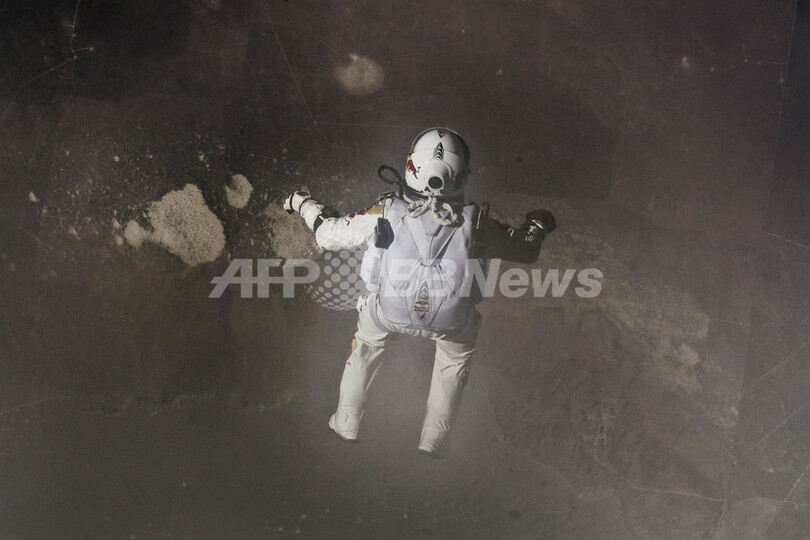 【10月15日 AFP】(写真追加)高所からパラシュートを使って飛び降りる「フリーフォール」の第一人者、オーストリア人のフェリックス・バウムガルトナー(Felix Baumgartner)氏(43)は14日、ヘリウムを詰めた気球で高度12万8097フィート(約3万9044メートル)に上がったカプセルからダイビングを行い、飛び降りてから4分20秒後にパラシュートを開いて米ニューメキシコ(New Mexico)州ロズウェル(Roswell)に無事に着地した。