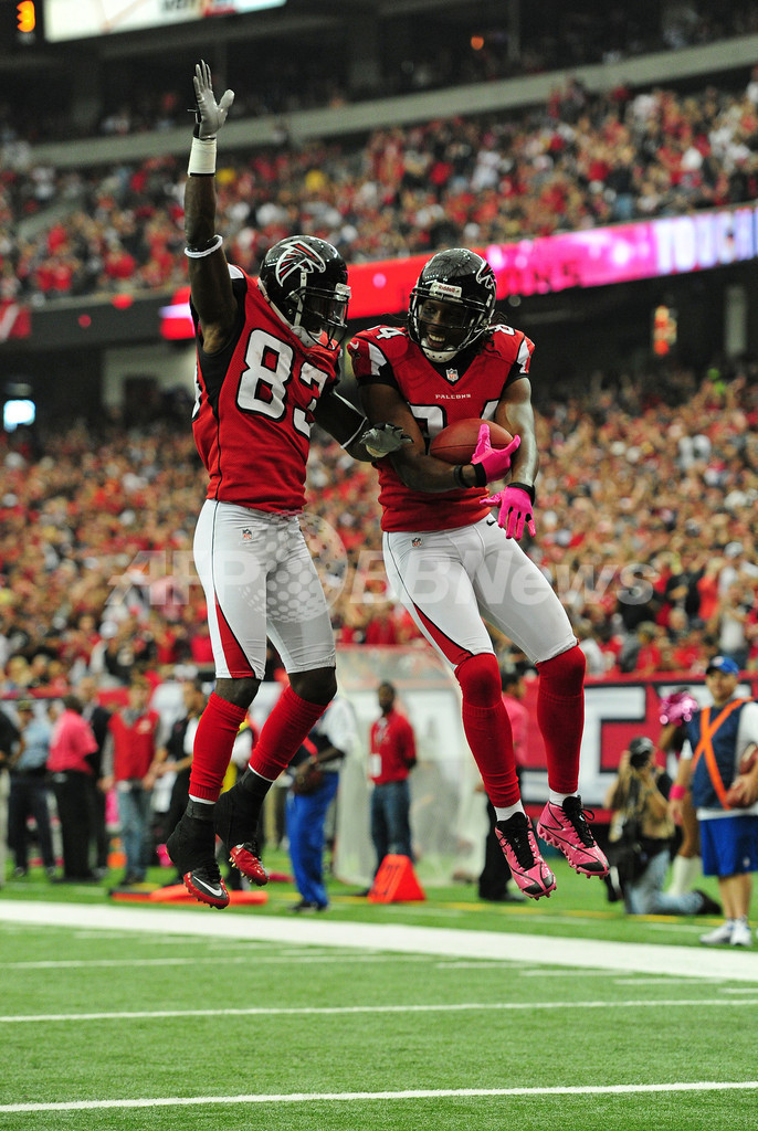 タッチダウンを決め、チームメイトのハリー・ダグラス(Harry Douglas、左)と歓喜するアトランタ・ファルコンズのロディ・ホワイト(Roddy White、2012年10月14日撮影)。(c)AFP/Getty Images/Kevin C. Cox