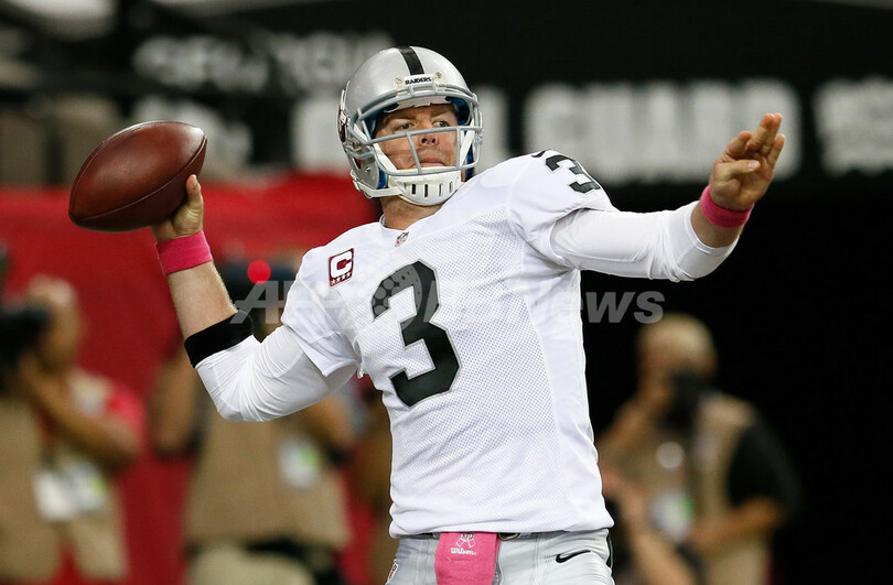 パスを狙うオークランド・レイダースのカーソン・パーマー(Carson Palmer、2012年10月14日撮影)。(c)AFP/Getty Images/Kevin C. Cox