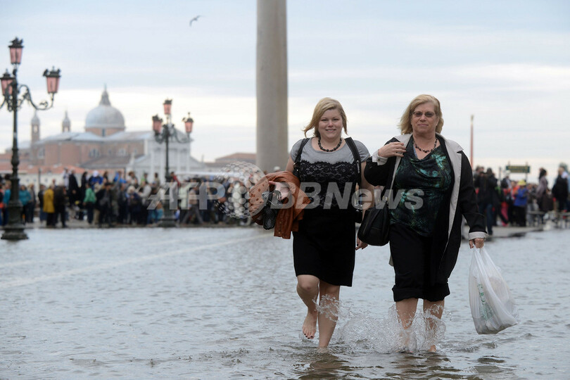 写真は冠水したサンマルコ広場をはだしで歩く観光客(2012年10月15日撮影)。(c)AFP/ANDREA PATTARO