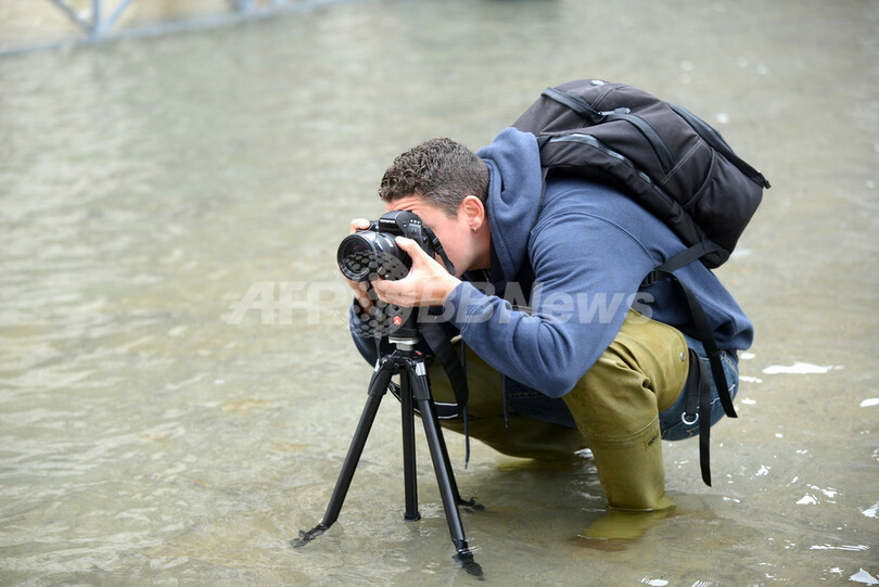 写真は冠水したサンマルコ広場で写真を撮る観光客(2012年10月15日撮影)。(c)AFP/ANDREA PATTARO