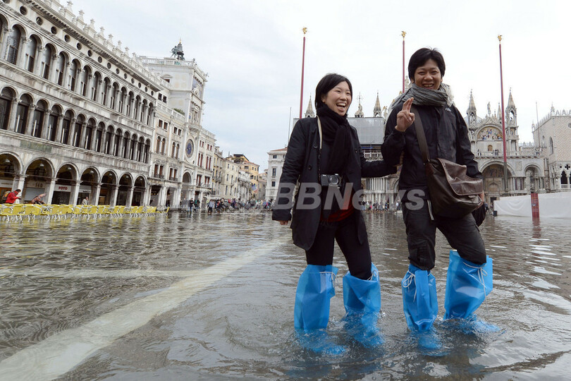 写真は冠水したサンマルコ広場で、ビニール袋を足に履いて歩く観光客(2012年10月15日撮影)。(c)AFP/ANDREA PATTARO