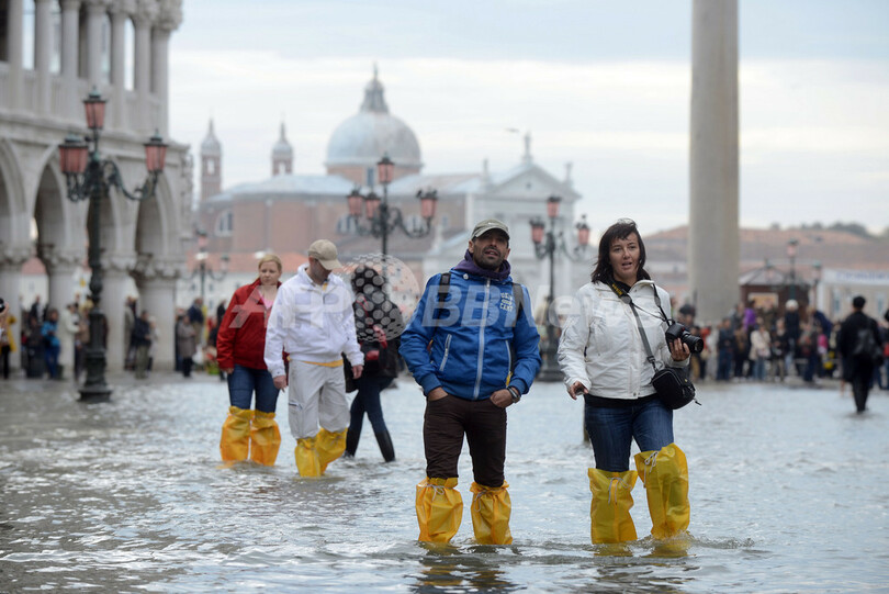 写真は冠水したサンマルコ広場で、ビニール袋を足に履いて歩く観光客(2012年10月15日撮影)。(c)AFP/ANDREA PATTARO