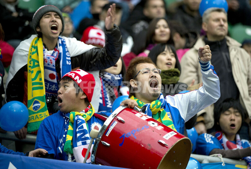声援を送る日本のサポーター(2012年10月16日撮影)。(c)AFP/ODD ANDERSEN