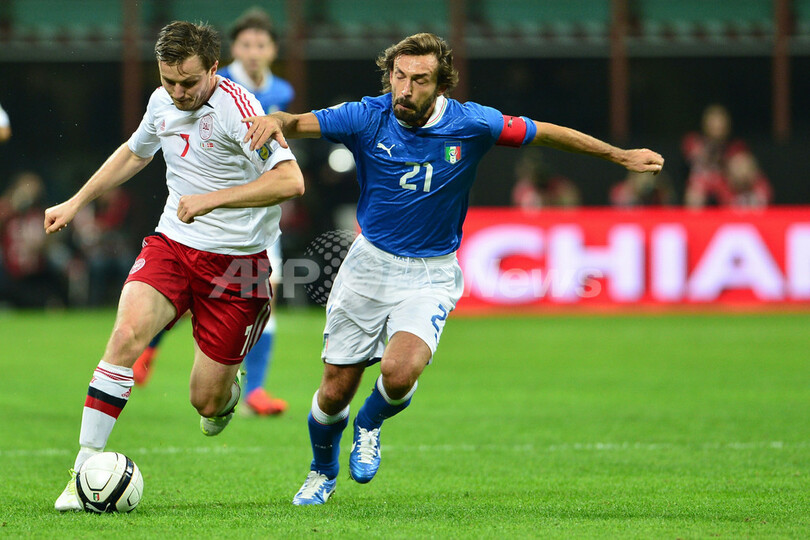 デンマークのウィリアム・クヴィスト・ヨルゲンセン(William Kvist Jorgensen、左)とボールを競るイタリアのアンドレア・ピルロ(Andrea Pirlo、2012年10月16日撮影)。(c)AFP/GIUSEPPE CACACE