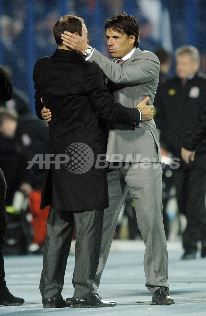 試合後に健闘を称えあうクロアチアのイゴール・スティマッチ(Igor Stimac)監督(左)とウェールズのクリス・コールマン(Chris Coleman)監督(2012年10月16日撮影)。(c)AFP/Hrvoje POLAN