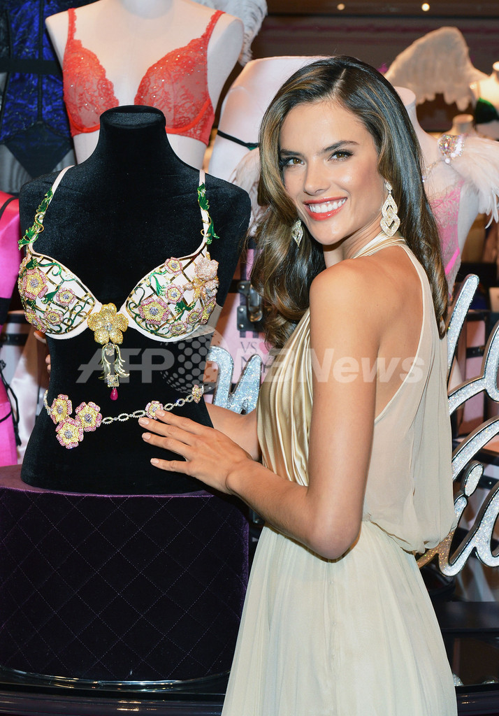 ニューヨーク(New York)のヘラルドスクエア(Herald Square)で開かれた発表イベントには、今年の「エンジェル」(広告モデル)であるアレッサンドラ・アンブロジオ(Alessandra Ambrosio)さんが登場。笑顔で豪華ブラを紹介したほか、ブラと同デザインの50万ドル(約4000万円)相当の新作香水「ボムシェル・ファンタジー・フラグランス(Bombshell Fantasy Fragrance)」もお披露目した。(c)AFP(2012年10月18日撮影)。(c)AFP/Getty Images/Slaven Vlasic