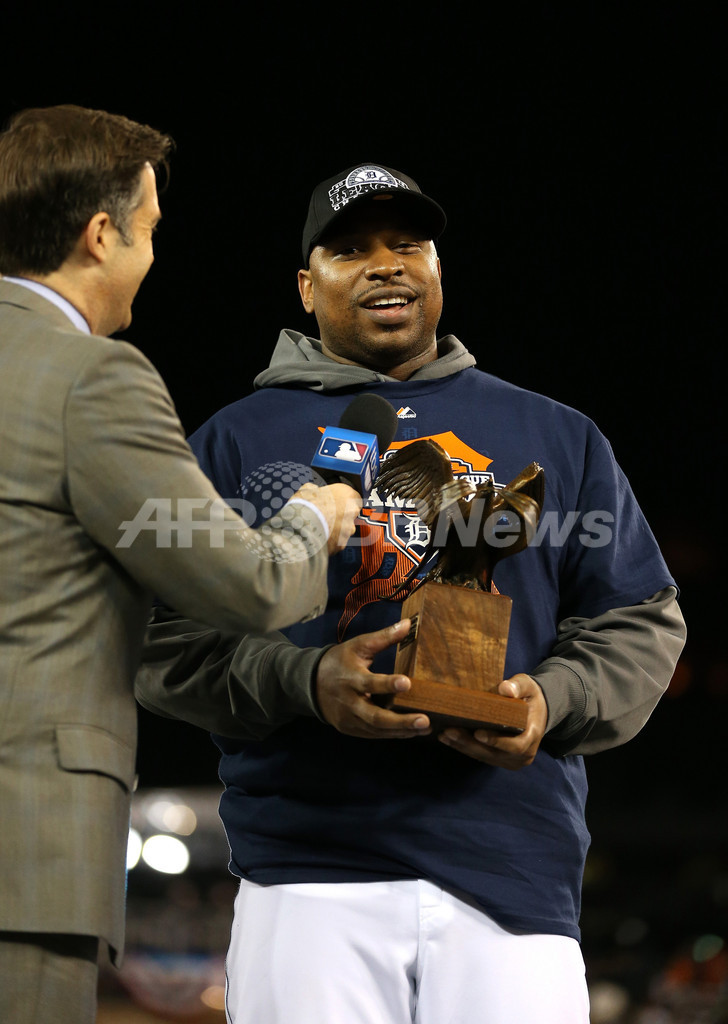 シリーズ最優秀選手(MVP)に選出され、トロフィーを手にするデトロイト・タイガースのデルモン・ヤング(Delmon Young、2012年10月18日撮影)。(c)AFP/Getty Images/Jonathan Daniel