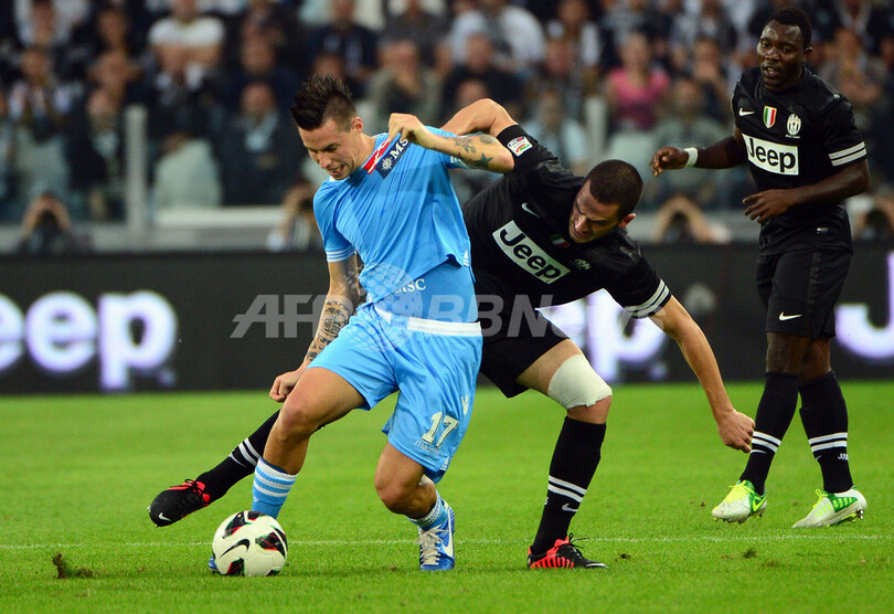 ユベントスのレオナルド・ボヌッチ(Leonardo Bonucci、中央)を背にボールをキープするナポリのマレク・ハムシク(Marek Hamsik、左、2012年10月20日撮影)。(c)AFP/OLIVIER MORIN