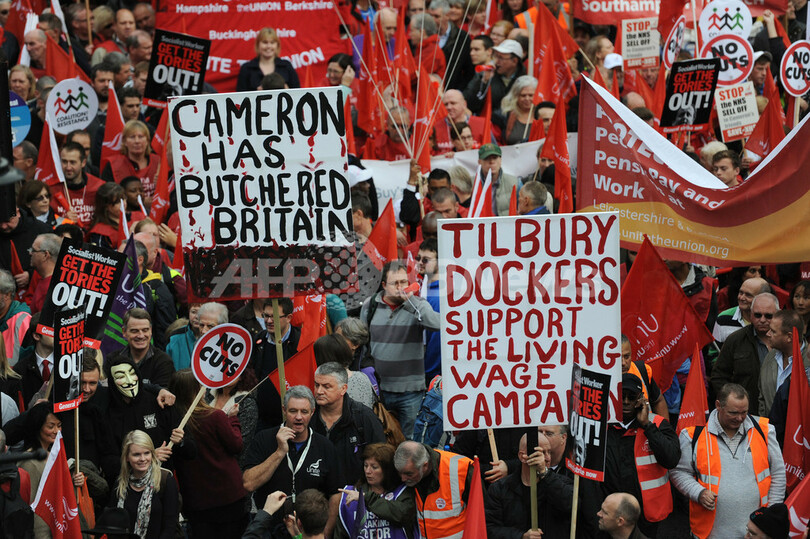 ロンドン中心部約4.8キロを進んだデモ行進では、参加者がデービッド・キャメロン(David Cameron)首相率いる連立政権が導入した緊縮財政策を非難し「削減はダメ」、「キャメロンはイギリスを殺した」などと書かれたプラカードを掲げた。ダウニング街10番地(10 Downing Street)の首相官邸前を通過する際にはブーイングが湧き起こった。