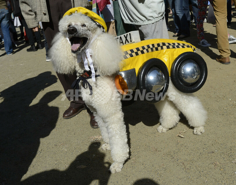 写真は、ニューヨーク名物のタクシー、イエローキャブをイメージした衣装でパレードに参加するイヌ(2012年10月20日撮影)。(c)AFP/TIMOTHY A. CLARY