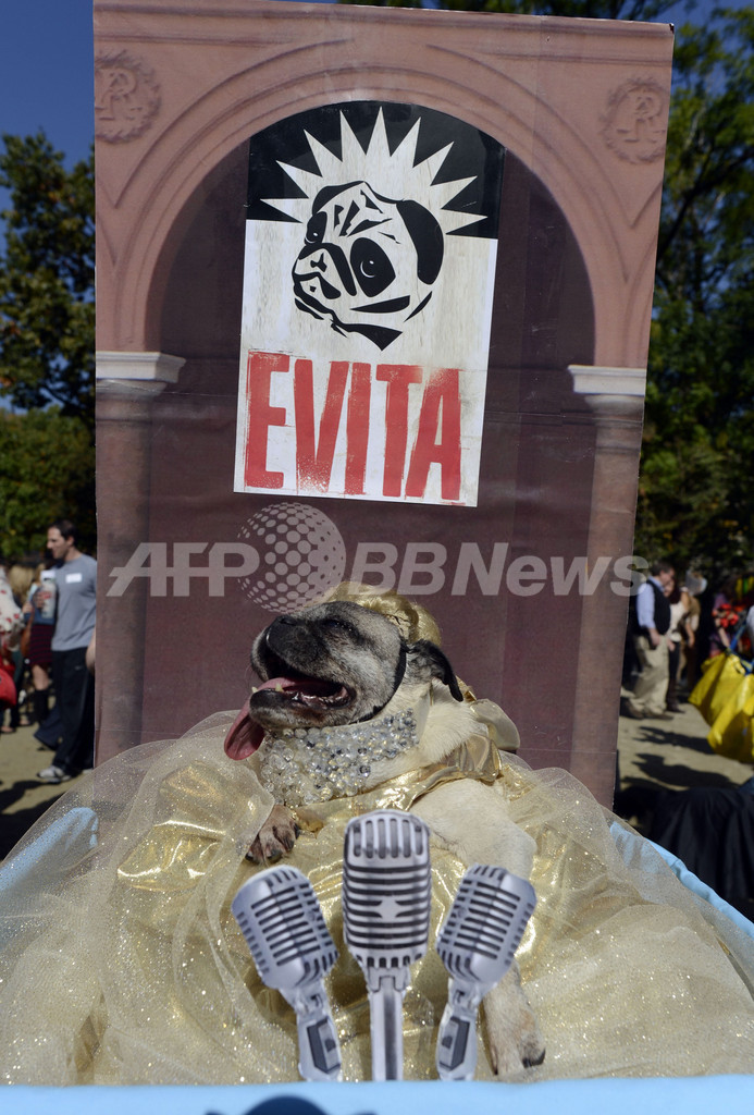 写真は、アルゼンチン大統領夫人だったエビータ(Evita Peron)の仮装でパレードに参加するイヌ(2012年10月20日撮影)。(c)AFP/TIMOTHY A. CLARY