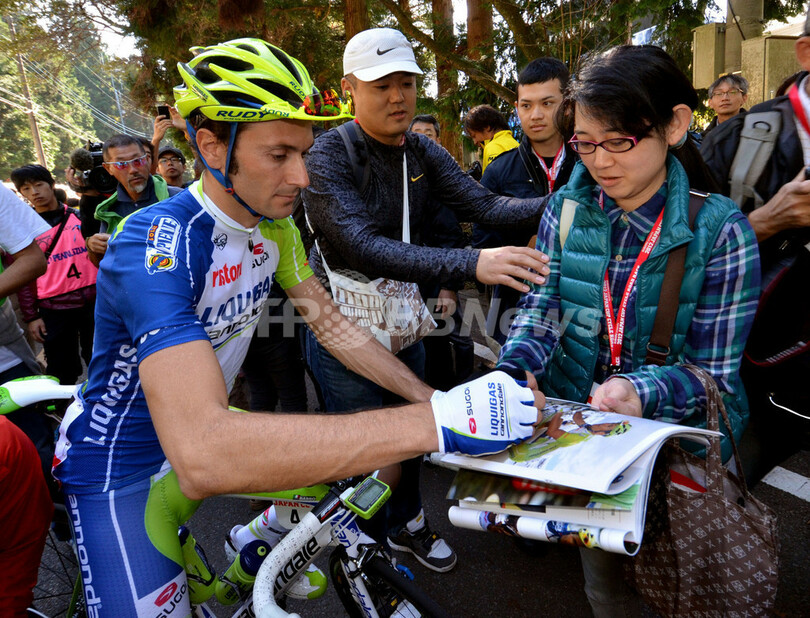 レース開始を前にファンのサインに応じるリクイガス・キャノンデールのイヴァン・バッソ(2012年10月21日撮影)。(c)AFP/Yoshikazu TSUNO