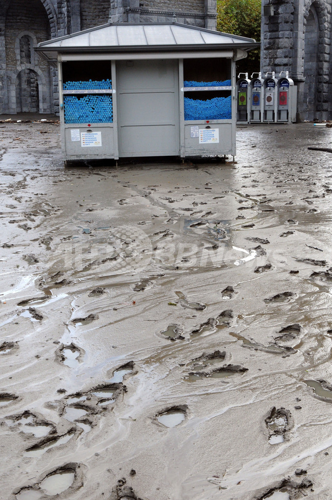 【10月22日 AFP】キリスト教カトリックの聖地「ルルドの泉」で有名なフランス南西部の町ルルド(Lourdes)で20日、長雨による洪水が発生し、巡礼者ら450人以上が避難する事態となった。水は21日になって引き始め、商店などでは週明けからの営業再開に向けて片付けを急ぐ姿が見られた。だが、聖母マリアが現れたという「マッサビエルの洞窟(Massabielle Cave)」周辺は冠水したままで、町内を流れるポー川(Gave de Pau)の沿道も10センチメートルもの泥に覆われるなど、ただでさえユーロ危機のあおりを受けている町にとっては手痛い被害となっている。