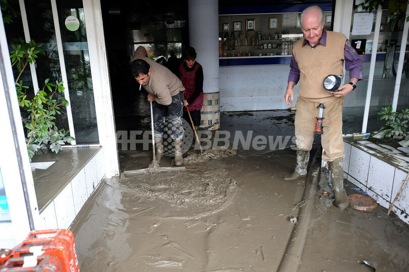 写真は、町内のホテルで洪水の後片付けに追われる人々(2012年10月21日撮影)。(c)AFP/REMY GABALDA