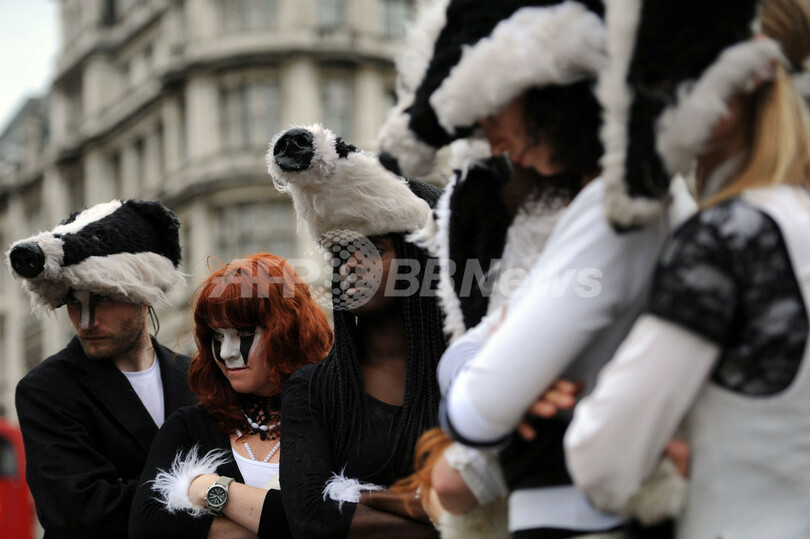 この集団は、インターネットを介した呼びかけに応じて面識のない者同士が特定の場所に集結する「フラッシュモブ」で集まった人々。ダンスは、畜牛の間に結核感染が広がっている問題への対処策として9月18日にアナグマの大量駆除を政府が許可したことに抗議するものだという。法案が可決されれば、イングランド(England)地方で駆除されるアナグマは3000匹に上るという。(c)AFP