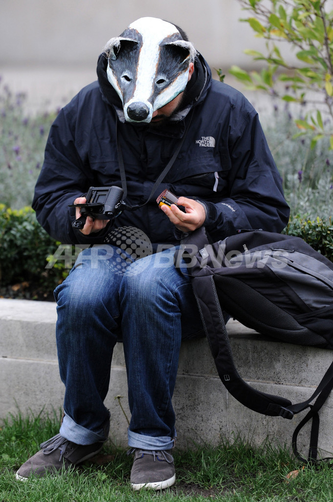 【10月22日 AFP】英ロンドン(London)の国会議事堂(Houses of Parliament)前に21日、アナグマの扮装(ふんそう)で踊る一団が現れた。