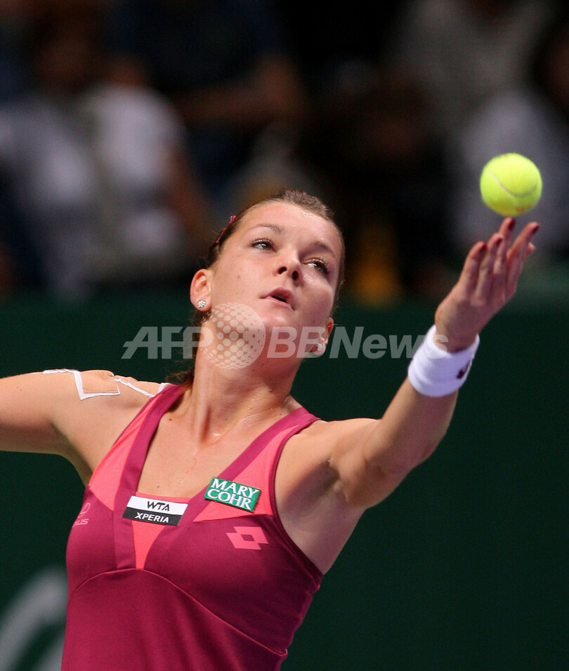 サーブを打つアニエスカ・ラドワンスカ。(2012年10月23日撮影)。(c)AFP