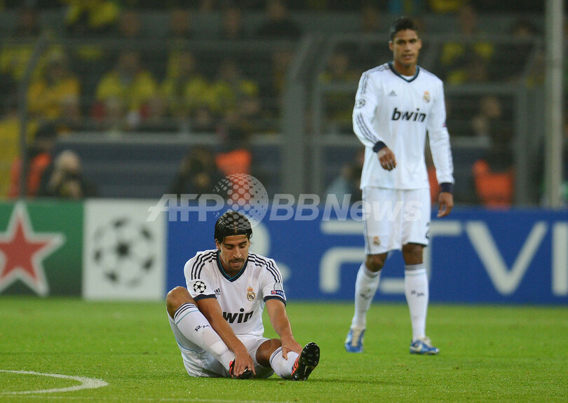 負傷してピッチに座り込むレアル・マドリードのサミ・ケディラ(Sami Khedira、2012年10月24日撮影)。(c)AFP/PATRIK STOLLARZ