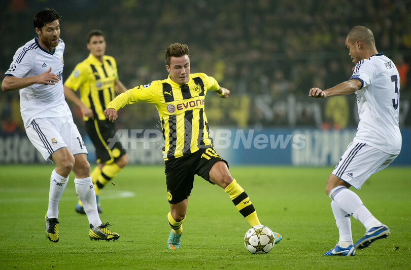 レアル・マドリードのペペ(Pepe、右)とシャビ・アロンソ(Xabi Alonso、左)の間を突破するボルシア・ドルトムントのマリオ・ゲッツェ(Mario Goetze、中央、2012年10月24日撮影)。(c)AFP/ODD ANDERSEN