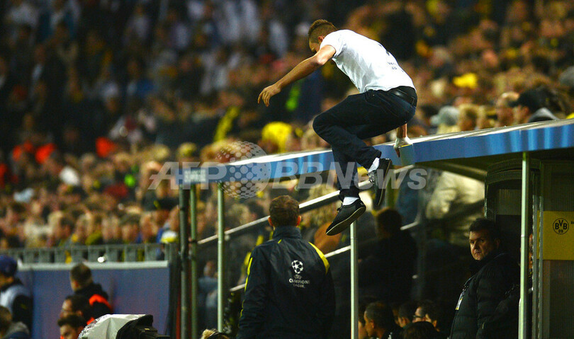 ピッチへ侵入する観客(2012年10月24日撮影)。(c)AFP/PATRIK STOLLARZ