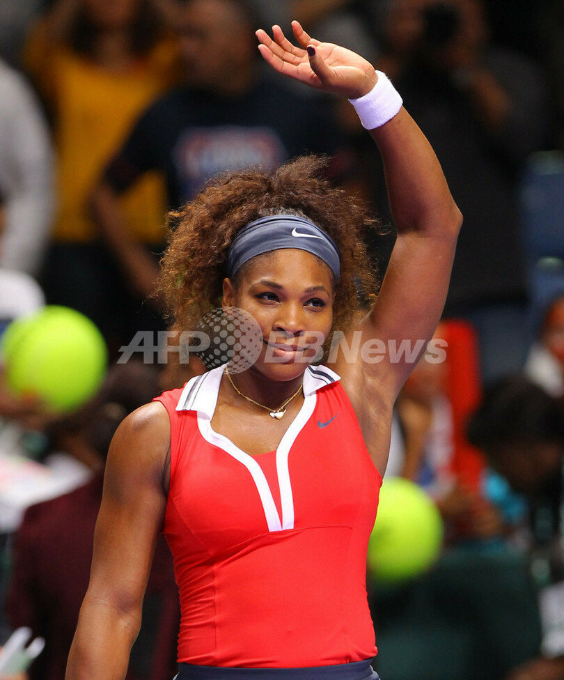 試合に勝利し、歓声に応えるセレーナ・ウィリアムス(2012年10月24日撮影)。(c)AFP