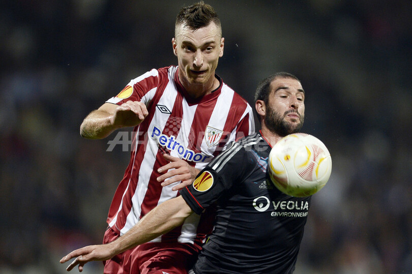 ボールを競るアスレティック・ビルバオのフェルナンド・アモレビエタ(Fernando Amorebieta、左)とオリンピック・リヨンのリサンドロ・ロペス(Lisandro Lopez、2012年10月25日撮影)。(c)AFP/JEFF PACHOUD