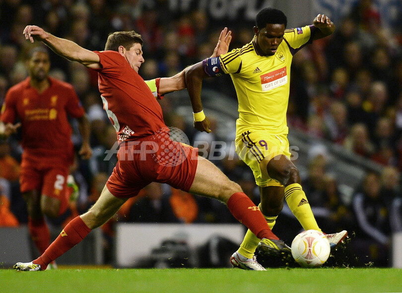 ボールを競るリバプールのスティーブン・ジェラード(Steven Gerrard、左)とアンジ・マハチカラのサミュエル・エトー(Samuel Eto'o、2012年10月25日撮影)。(c)AFP/ANDREW YATES