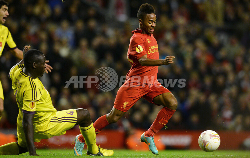 アンジ・マハチカラのクリストファー・サンバ(Christopher Samba、左)をかわしてボールを運ぶリバプールのラヒーム・スターリング(Raheem Sterling、2012年10月25日撮影)。(c)AFP/ANDREW YATES