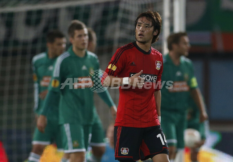 チームの先制ゴールを喜ぶバイヤー・レバークーゼンの細貝萌(Hajime Hosogai、2012年10月25日撮影)。(c)AFP/ALEXANDER KLEIN