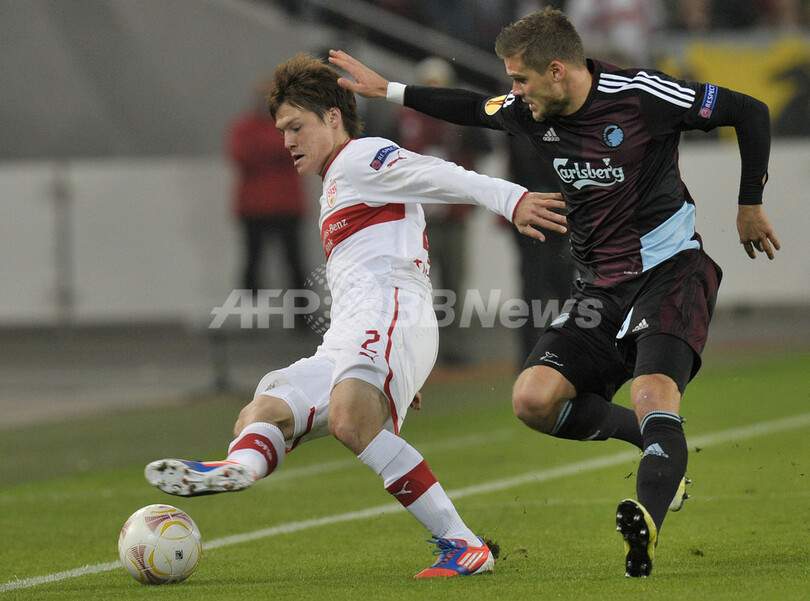 FCコペンハーゲンのルリック・ギスラソン(Rurik Gislason、右)とボールを競るVfBシュツットガルトの酒井高徳(Gotoku Sakai、2012年10月25日撮影)。(c)AFP/THOMAS KIENZLE