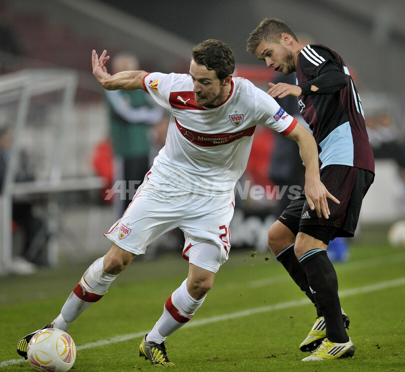 FCコペンハーゲンのルリック・ギスラソン(Rurik Gislason、右)の前でボールをコントロールするVfBシュツットガルトのクリスティアン・ゲントナー(Christian Gentner、2012年10月25日撮影)。(c)AFP/THOMAS KIENZLE