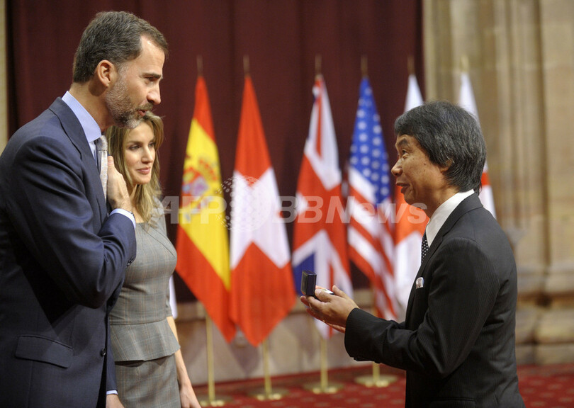 写真は授賞式でフェリペ皇太子(Crown Prince Felipe、左)と言葉を交わす宮本氏(2012年10月26日撮影)。(c)AFP/MIGUEL RIOPA