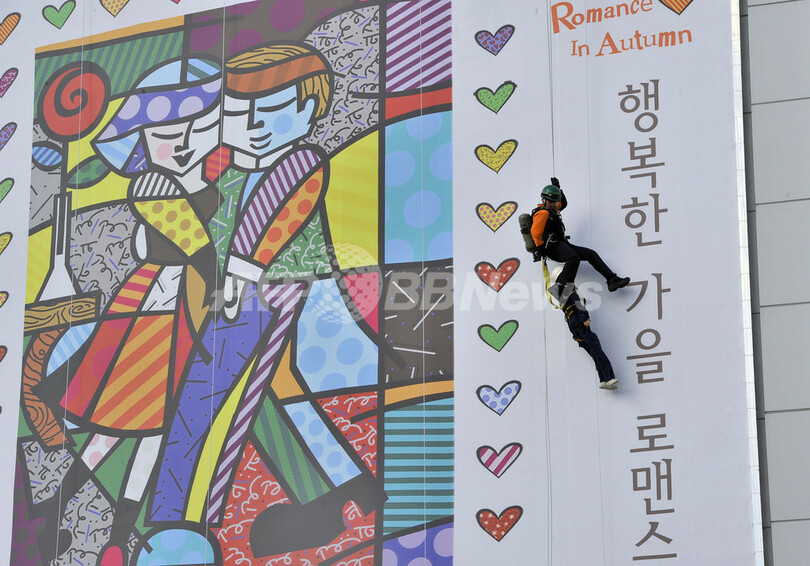 写真は、ソウル市内のデパート壁面を降下しながら人間に見立てた人形を「救出」する消防隊員(2012年10月24日撮影)。(c)AFP/ JUNG YEON-JE