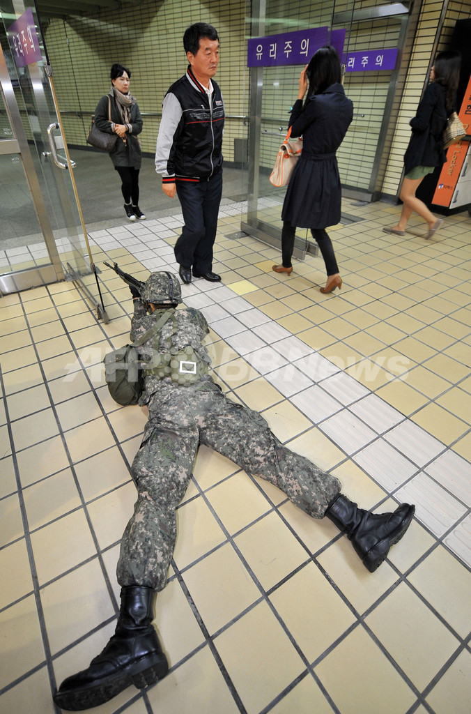 写真は、ソウル市内の地下通路で銃を構える兵士(2012年10月25日撮影)。(c)AFP/ JUNG YEON-JE