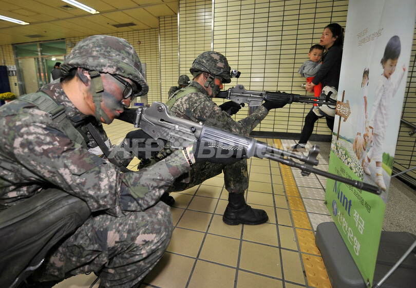 写真は、ソウル市内の地下通路で銃を構える兵士(2012年10月25日撮影)。(c)AFP/ JUNG YEON-JE