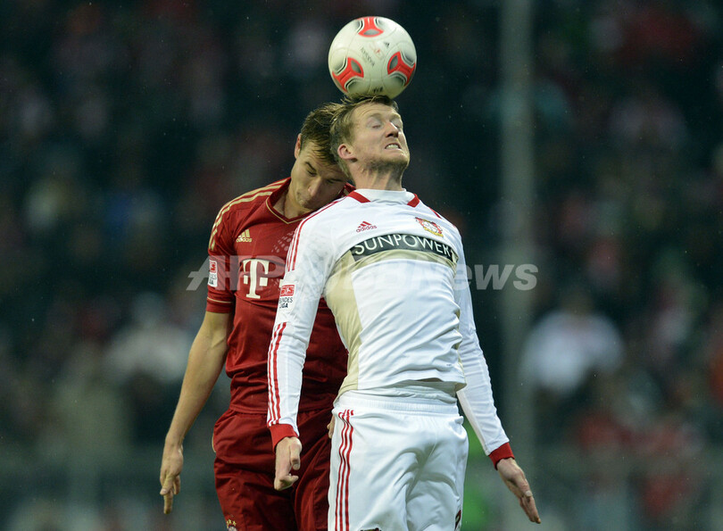 バイエルン・ミュンヘンのホルガー・バドシュトゥバー(Holger Badstuber、奥)とヘディングでボールを競るバイヤー・レバークーゼンのアンドレ・シュールレ(Andre Schuerrle、2012年10月28日撮影)。(c)AFP/CHRISTOF STACHE