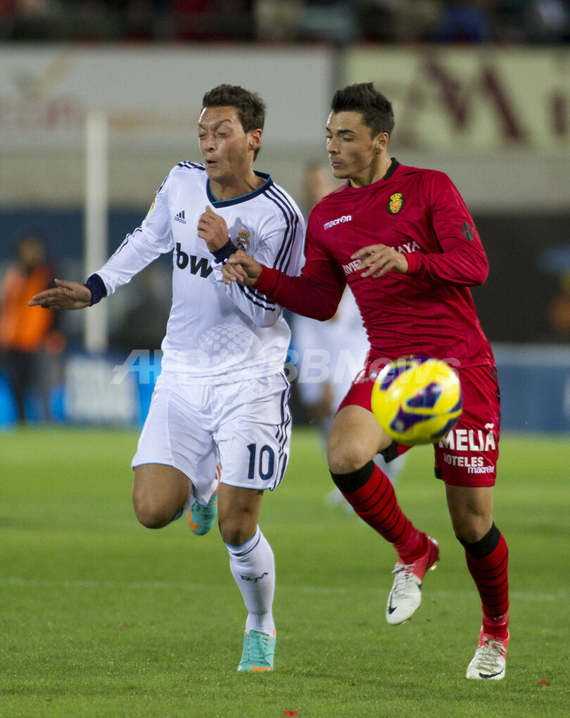 ボールを競るマジョルカのシモ・ナバーロ(Ximo Navarro、右)とレアル・マドリードのメスト・エジル(Mesut Ozil、2012年10月28日撮影)。(c)AFP/Jaime REINA