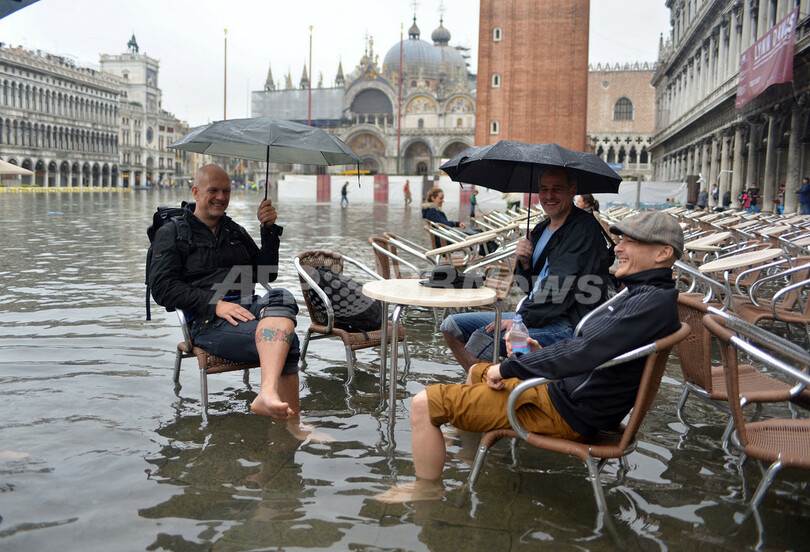 写真は、冠水したサン・マルコ広場(St Mark's Square)のカフェで談笑する観光客たち。この日の水位は127センチまで上昇した(2012年10月27日撮影)。(c)AFP/ANDREA PATTARO