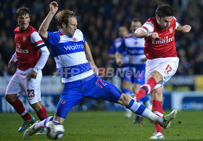 レディングのカスパルス・ゴルクス(Kaspars Gorkss、左)のブロックをかわしてシュートを放つアーセナルのオリヴィエ・ジルー(Olivier Giroud、右、2012年10月30日撮影)。(c)AFP/BEN STANSALL